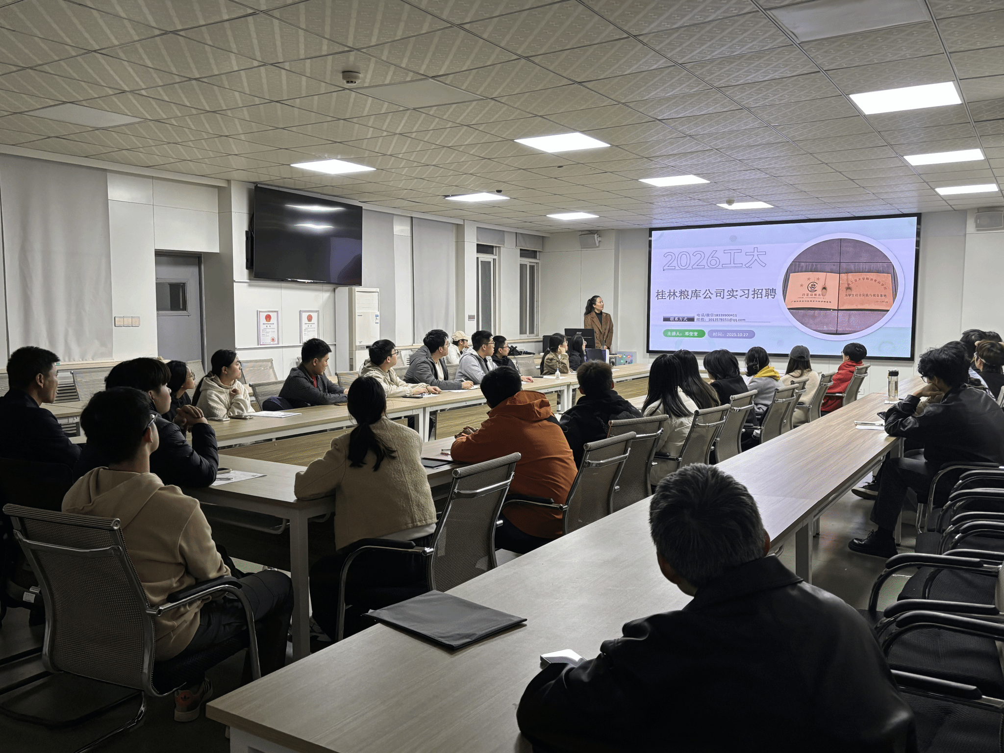 毕业生就业渠道,2025年10月27日,桂林粮食储备库有限公司专场招聘会在我院40202捷赛厅顺利举办。桂林粮库公司副总经理黄金宏、桂林粮库公司仓储部副经理邓莹莹和桂林粮库公司办公室副主任李杏参加本次活动,招聘会前与学院党委副书记梁艳、学工办主任马春艳和团委副书记刘宇畅老师进行了深入的交流。此次活动作为学院在职业生涯大赛期间的重要就业活动,吸引了50余名2026届毕业生踊跃参与,为同学们的职业生涯规划提供了宝贵的实践指引。